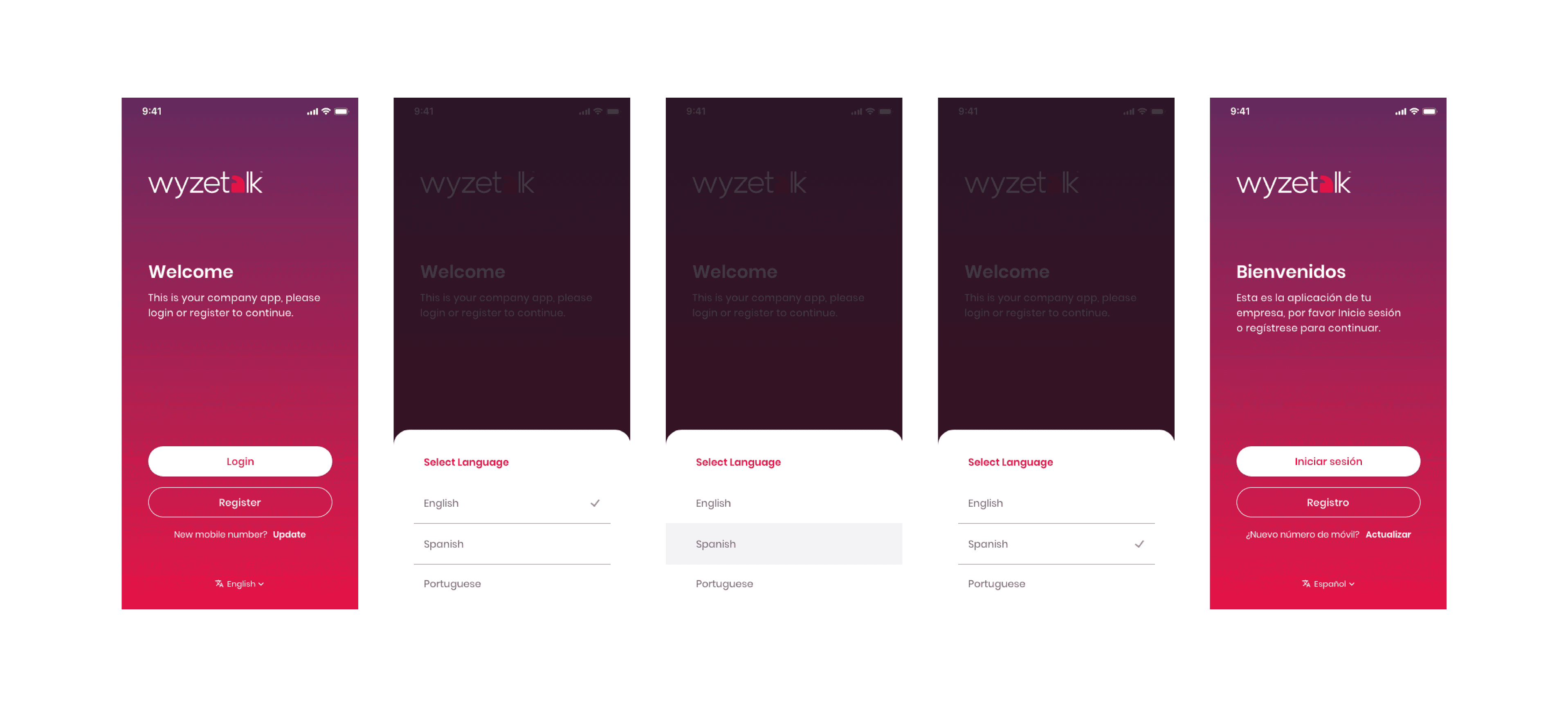 In 2019 Wyzetalk wanted to move Flutter — an opportunity to rebuild the app properly from the ground up. Working with Google Material Design, we created a theming system flexible enough to support multi-brand, multi-language deployments across a growing enterprise client base. This is the onboarding and authentication flow that set the foundation for everything that followed.